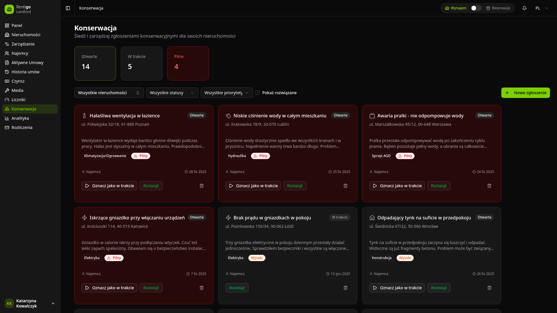 Najemcy zgłaszają → Ty śledzisz status → historia zostaje na zawsze. Koniec z gubionymi zgłoszeniami w czatach.